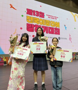 제주국제교육원(원장 서자양)은 지난 8일 서울에서 열린 제13회 전국이중언어말하기대회에서 제주지역 대표로 참가한 학생 3명 전원이 입상하는 성과를 거뒀다고 17일 밝혔다.전국이중언어말하기대회는 이주배경학생의 언어 역량을 발굴하고 긍정적 자아개념 형성을 돕기 위해 교육부가 2013년부터 운영해 온 대회로 올해 제주대표 3명은 지난 6월 제주예선대회에서 우수한 성적을 거둔 초등부 2명과 중등부 1명이다.제주대표 학생들은 한국어와 부모의 모국어로 자신의 이야기를 발표하며 언어적 강점과 문화적 감수성을 발휘해 중등부 은상 한림여중 장세림(