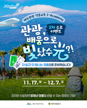 제주관광공사(사장 고승철)는 오는 12월 7일까지 ‘제주관광 전문교육 J-Academy’ 온라인 플랫폼에서 교육 수료 이벤트를 진행하고 있다고 17일 밝혔다.이번 이벤트는 제주관광 산업 종사자 및 관광 분야에 관심 있는 사람을 대상으로 적극적인 교육 참여 활성화를 유도하기 위해 기획됐다.이에, 공사는 J-Academy의 주요 강좌인 트렌드 교육, 직무교육, 제주 이해 교육 콘텐츠를 중심으로 수료 이벤트를 추진하고 있다.모든 교육과정은 무료로 참여가 가능하며, 참여 방법은 J-Academy 홈페이지(https://jacademy.ij