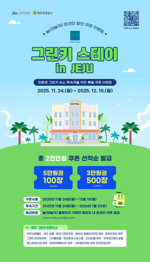 제주특별자치도와 제주관광공사(사장 고승철)는 오는 24일부터 12월 15일까지 환경친화적 경영활동을 실천하는 사업장에 부여하는 ‘그린키(Green Key)’ 국제인증을 획득한 도내 13개 숙박업소를 대상으로 온·오프라인 통합 이벤트를 진행한다고 19일 밝혔다.이번 이벤트는 그린키 인증 숙소의 홍보 강화와 더불어 제주를 찾는 여행객들이 보다 쉽게 친환경 숙소를 이용할 수 있도록 편의를 제공하기 위해 추진하는 가운데 도와 공사는 국내 대표 OTA(온라인 여행사) 플랫폼인 ‘놀(www.nol.yanolja.com)’을 통해 총 2,000