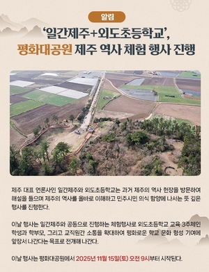 제주 대표 언론사인 일간제주와 외도초등학교는 과거 제주의 역사 현장을 방문하여 해설을 들으며 제주의 역사를 올바로 이해하고 민주시민 의식 함양에 나서는 뜻 깊은 행사를 진행한다.이날 행사는 일간제주와 공동으로 진행하는 체험행사로 외도초등학교 교육 3주체인 학생과 학부모, 그리고 교직원간 소통을 확대하여 평화로운 학교 문화 형성 기여에 앞장서 나간다는 목표로 전개해 나간다.이날 행사는 평화대공원에서 2025년 11월 15일(토) 오전 9시부터 시작된다.한편, 행사 진행된 내용에 대해 후속보도가 이어질 예정이다.