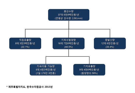 우선 제주에는 연평균 2061mm의 비가 내린다. 이를 수량으로 환산하면 총 37억6900만톤에 이르는 양이다. 전체 비의 양 가운데 12억6000만톤(33.4%)은 증발산작용을 통해 대기 중으로 증발이 되고 8억3300만톤(22.1%)은 하천을 통해 바다로 빠져 나간다.